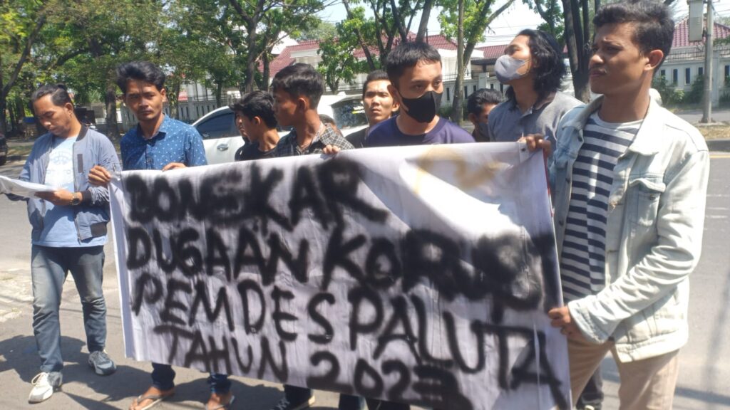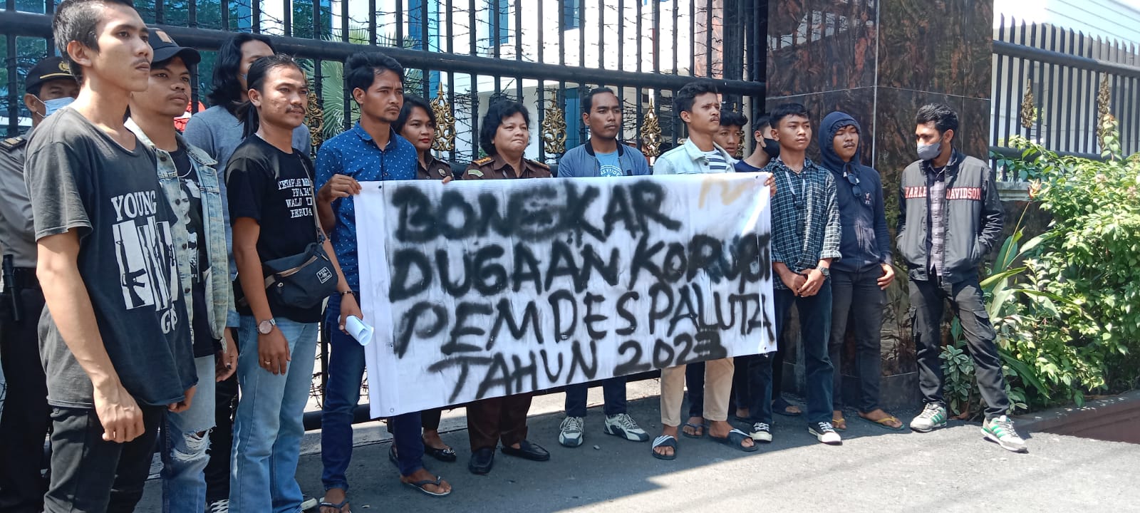 Merek juga membawa Spanduk yang bertuliskan : Bongkar Dugaan Korupsi PEMDES Paluta Tahun 2023.