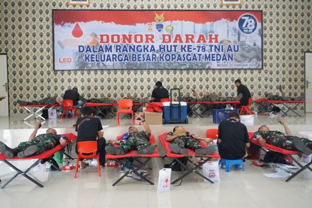 Dalam rangka memperingati HUT Ke-78 TNI Angkatan Udara, Kopasgat Wilayah Medan menggelar bakti sosial donor darah di Aula G Siahaan Yonko 469 Kopasgat. Rabu (29/02/2024)