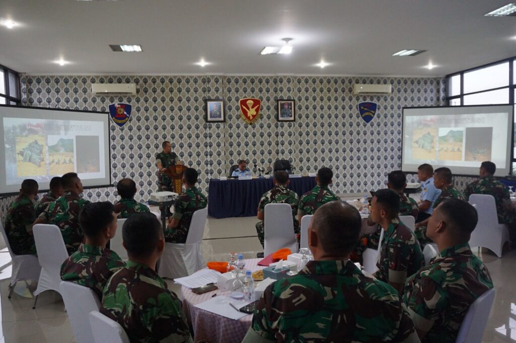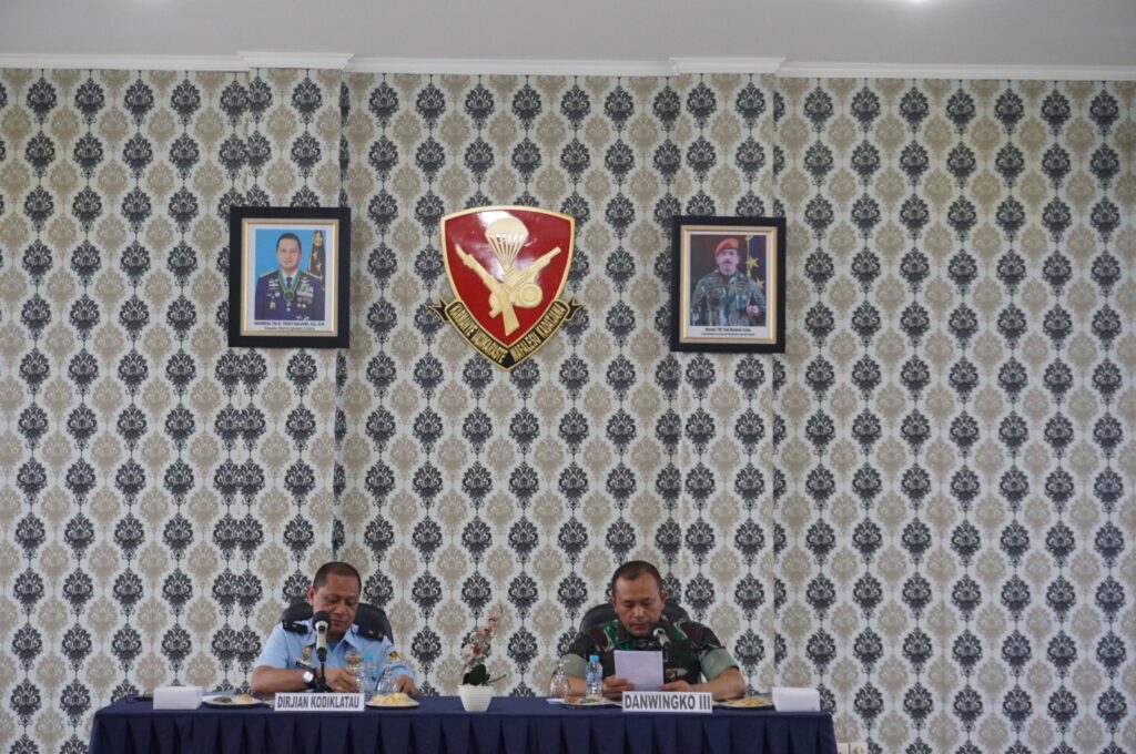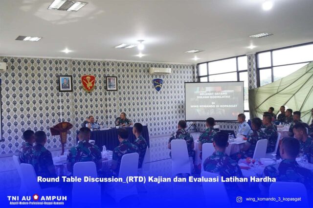 Bertempat di Ruang Briefing Yonko 469 Kopasgat , Komandan Wing Komando III Kopasgat Kolonel Pas Dili Setiawan, M.Si.(Han), menyambut Ditjian Kodiklatau Marsma TNI Putu Gede Suartika beserta tim dalam rangka Round Table Discussion pengkajian dan Evaluasi latihan Hardha Marutha III Ta. 2024. Rabu (26/06/24).